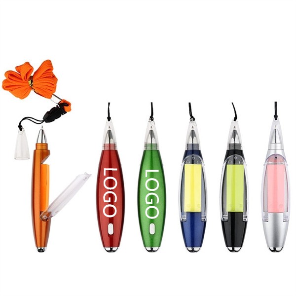 Multifunction Pen includes ballpoint pen, Sticky Notes, LED light and rope, it can be easily carried around with you by hanging on your neck . push the button at the pen's top part of body, you will see the small light from the pen's head. LED light can be used when walking or reading/writing on the note in a dark place. Logo are available!