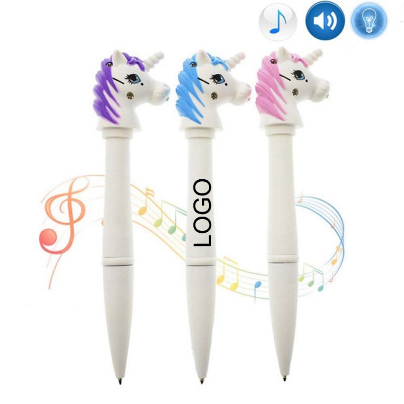 This unicorn ball pen is made of ABS. Press the switch button, the LED lights up, and accompanied by the unicorn's call, the bottom of the rotation can write out the refill. It can be used office, stationery, children's toys. It is 0.5 refill and contains three AG3 button batteries. We could printed logo on it and Please send detailed request for quotation
