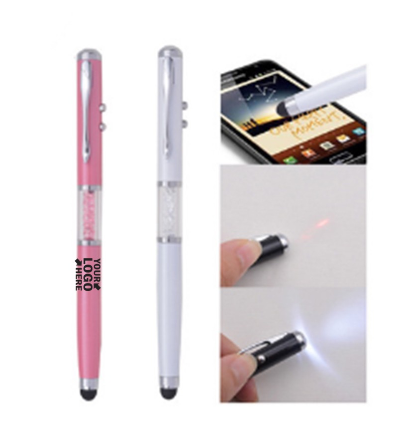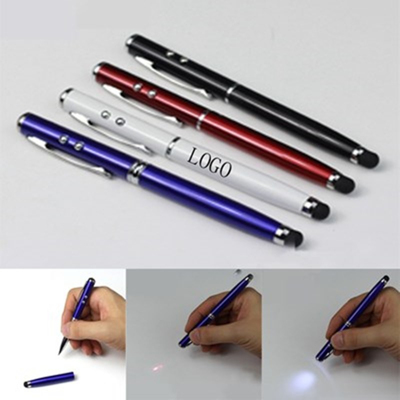 Functional stylus with soft rubber stylus for touchscreen devices,white LED and laser pointer which are all use a corresponding slider button to turn on and off.And with ballpointe pen inside. It's the perfect office companion! Add your imprint to pair your brand with multifunctional efficiency with these handy promotional tools today!Size:4.88"*d0.39"