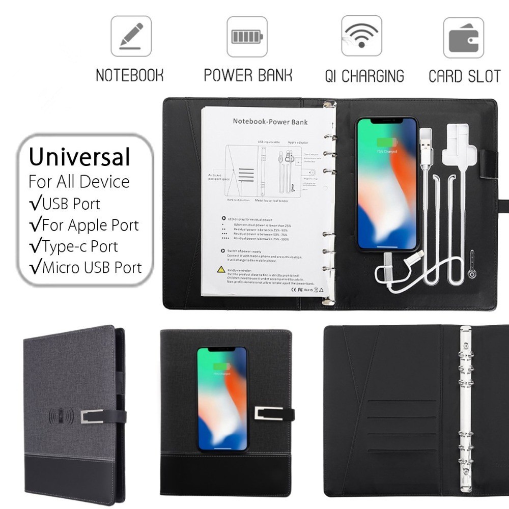 Not just a notebook, but also a power bank.Built-in 8000mAh battery, can be used as a power bank.3 charging connector, fit for most of cellphone.It's a six-ring folder with 80 lined pages.It includs 8000mAh power bank, charing cables, switch, money pocket, card sleeves, pen loop.Add an imprint and impress clients with a great gift! Logo Can be customized.
