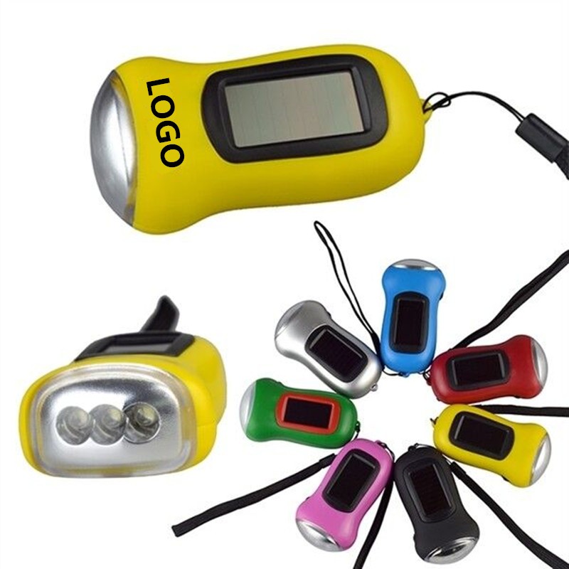 A bright and eco-friendly promotional LED flashlight that recharges by squeezing the charge handle. Never needs batteries! This solar-powered camping flashlight is equipped with 3 LED lights, which provide great lighting and last longer than in many life situations. With a full charge, the flashlight can stay powered at least 3-4 hours. Perfect for the night worker, campers, survivalists, power outages and more! Radiate your message from this customizable and bright flashlight!