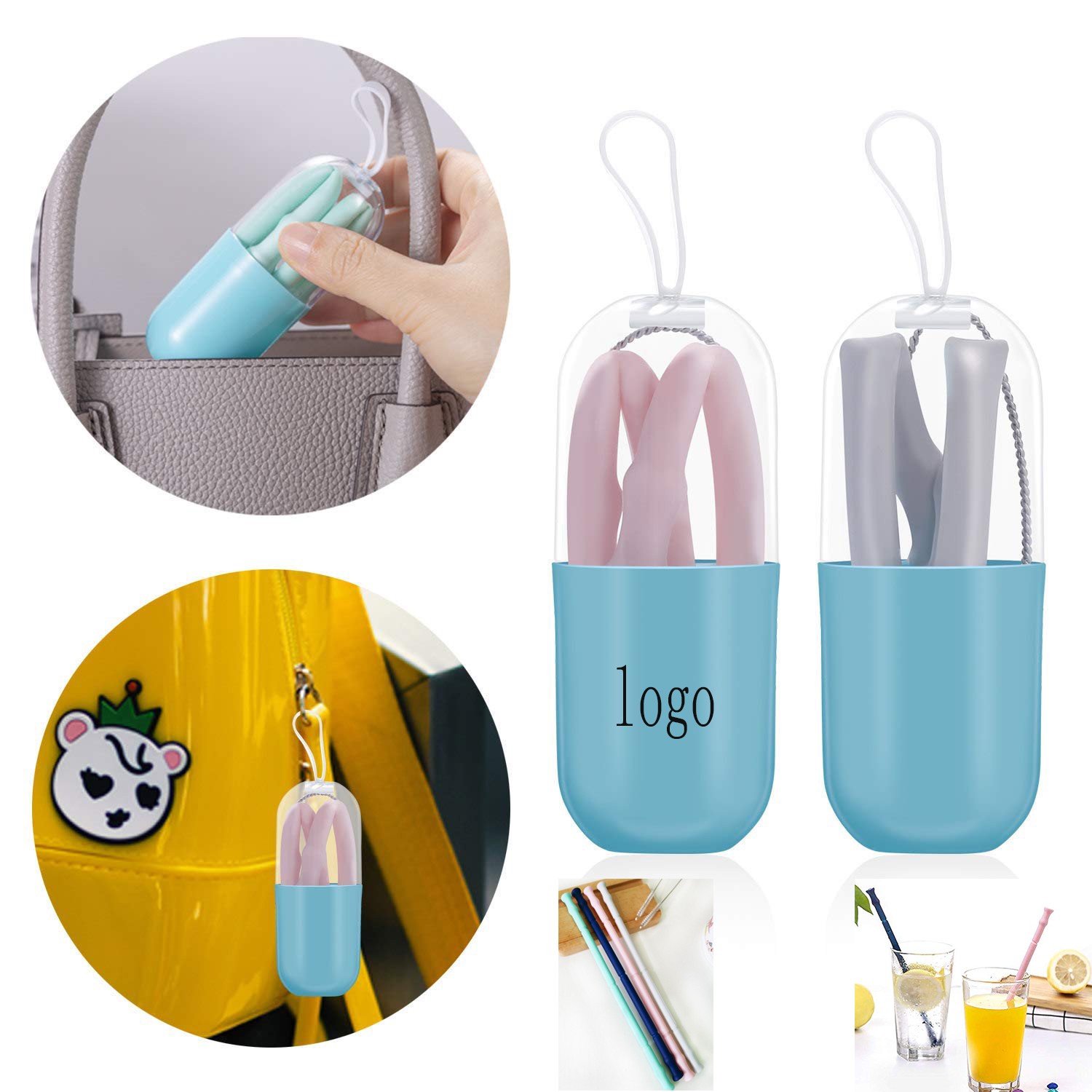 Reusable Silicone Drinking Straw in the pill shaped case with string . Cleaning brush included. You can just fold the straw into the case and put it in your pocket or pouch Hand-wash only.