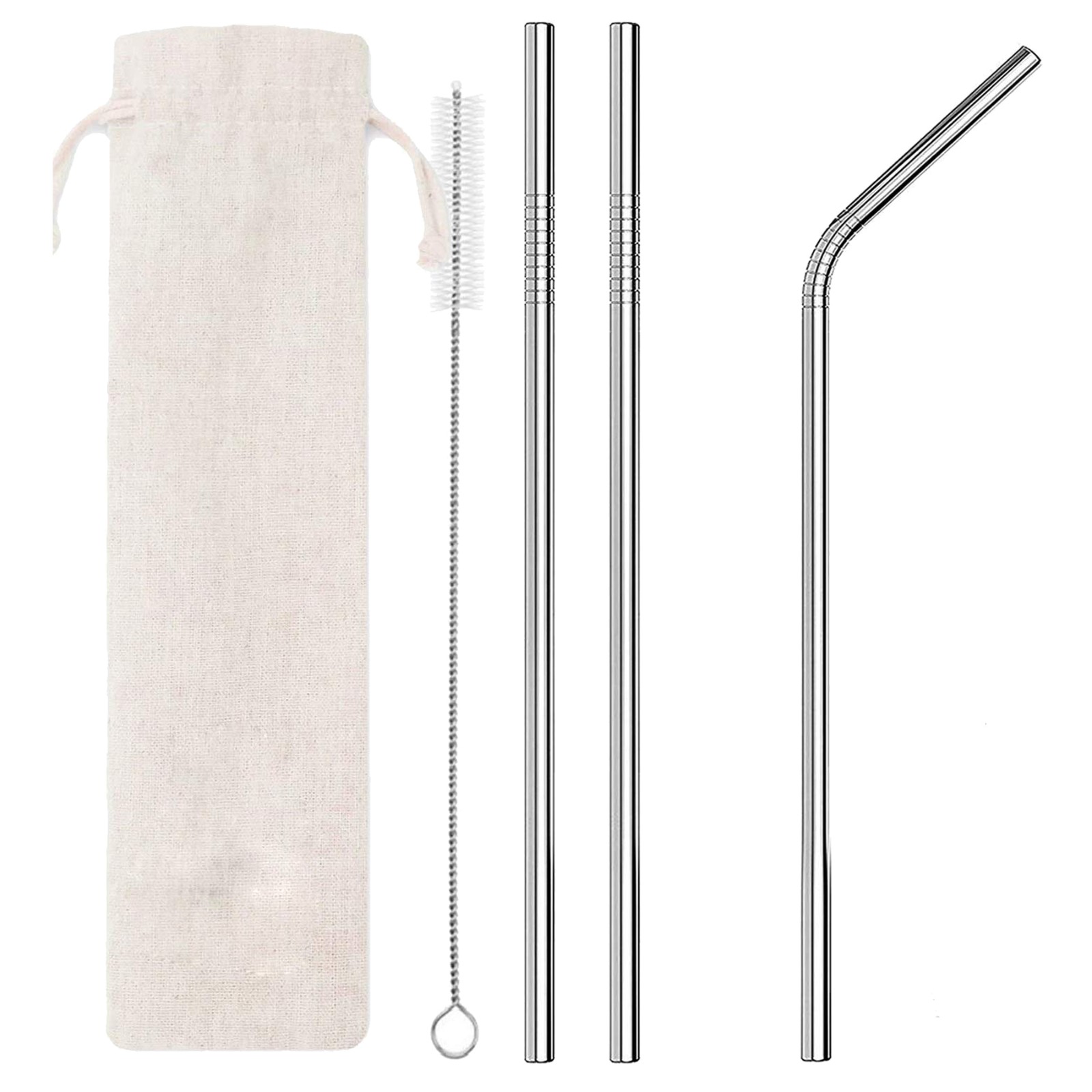 6 piece stainless steel straw set includes a 6oz. cotton drawstring carry pouch, a cleaning brush, 2 stainless steel straws (10 7/16 " x 6 mm 1 ,