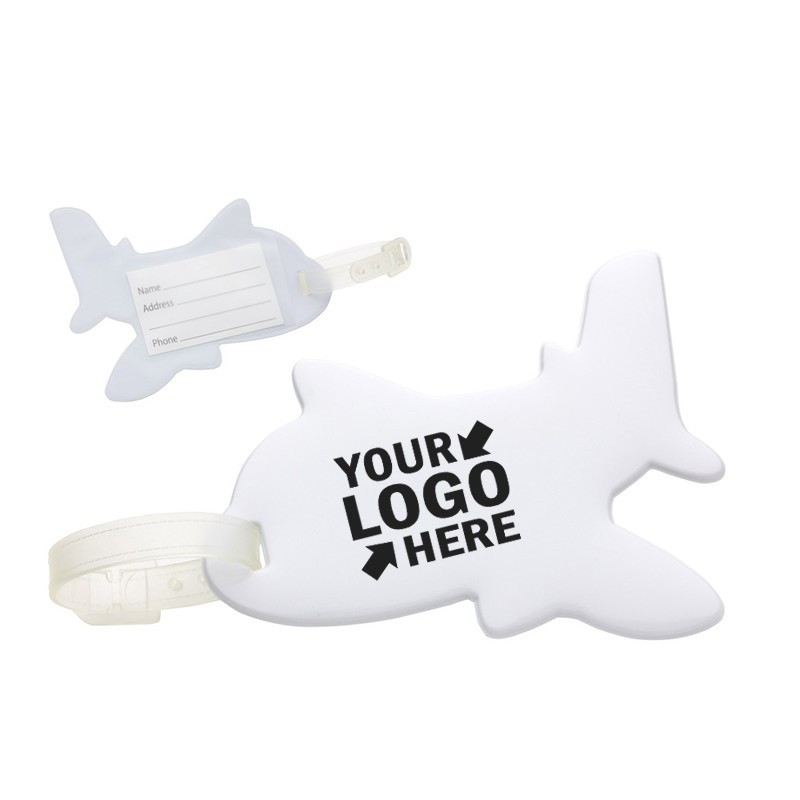 Eye-catching airplane shaped luggage tag! Made of environmentally friendly PVC. Keep track of your luggage in a busy terminal or train station with these durable luggage tags. Each 5" x 3 3/4" tag holds a business card for easy identification, and attaches simply to a suitcase, briefcase or laptop case by a rubber strap. Add your company logo or message to make for a great promotion and travel companion!