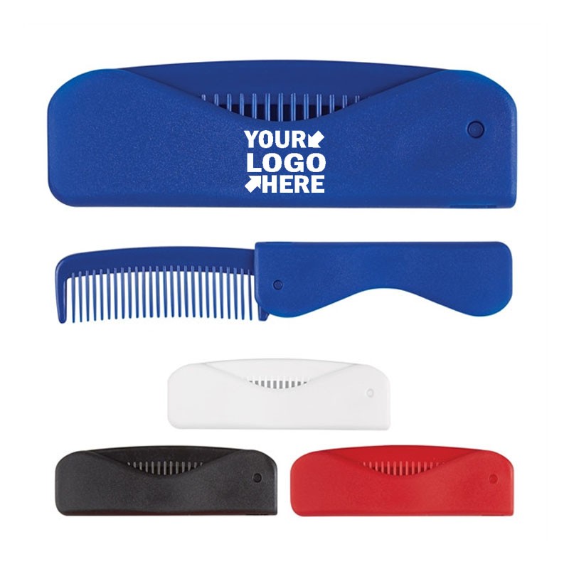 This folding comb is made of ABS, Folding size: 3 1/2" x 2 5/16" x 1", Development size: 6 1/2" x 2 3/16" x 1 5/8".It is very Portable and easy to carry. Logo are available, please feel free to contact us !