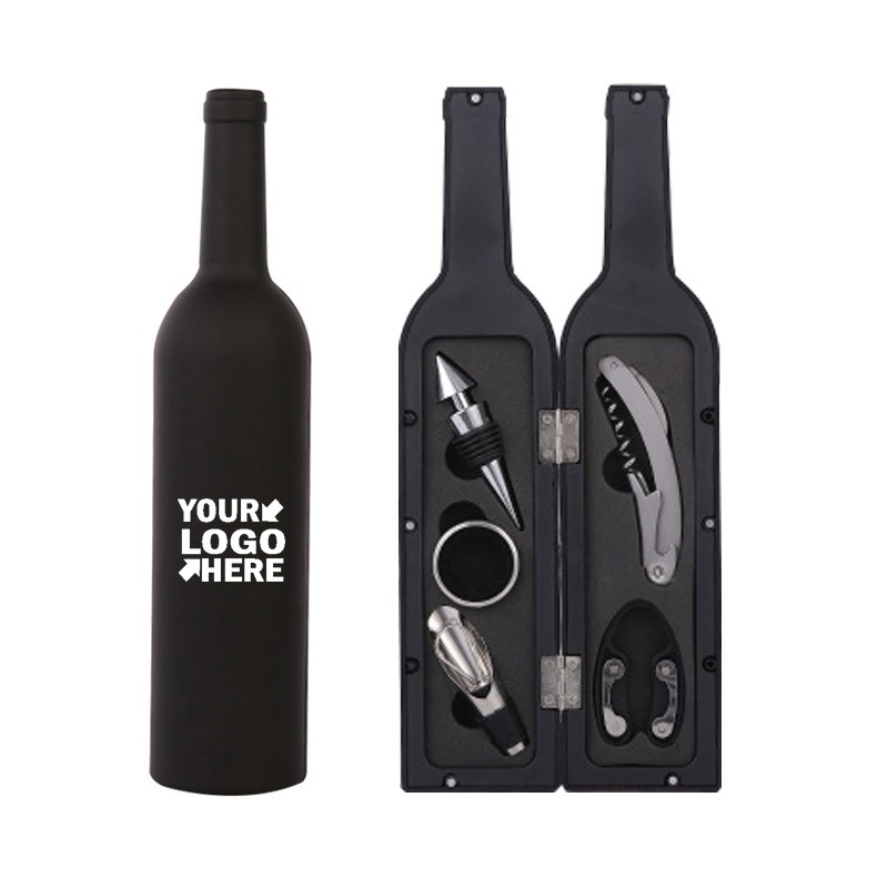 5 Piece wine tool set in wine bottle case. Comes with bottle opener, bottle stopper, drip ring, wine pourer and foil cutter. The set features all the necessities to pour the perfect glass in one great package. The wine bottle shape case stores easily in racks and cellars.