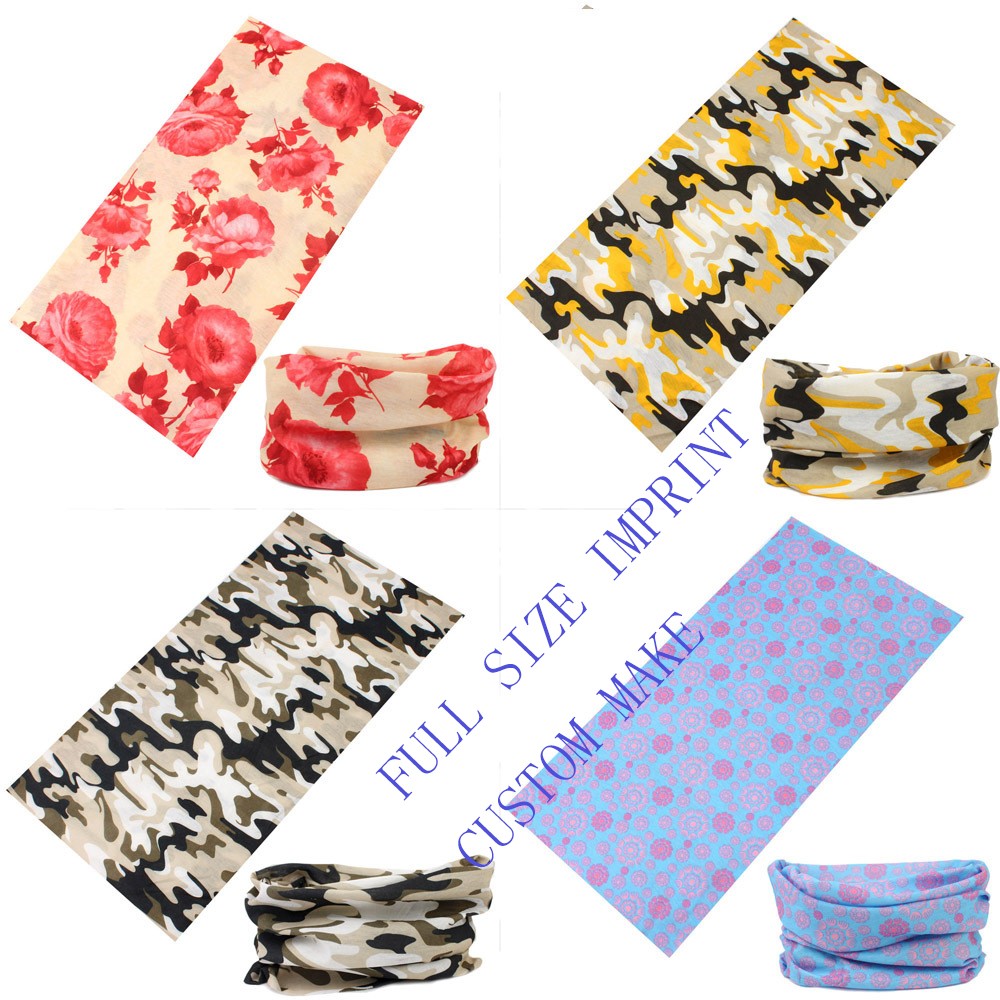 This magic scarf made of Polyester . Measuring 19.5"x9.8", Ideal for outdoor, it protect your face and neck from UV, sunlight and dust It can be worn in many ways: Headband, neckerchief, wristband, foulard, balaclava, scarf, Hairband, sahariane, pirate, mask, and cap, or any way you feel fits. . All our production and design just base on your logo.