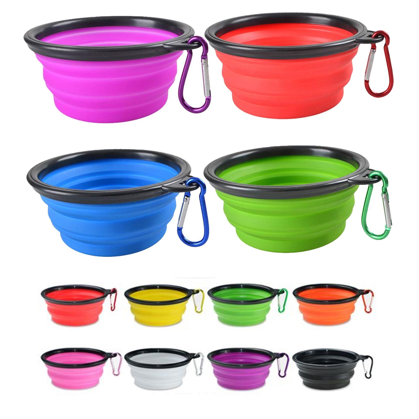 The bowls collapse completely flat, easy to storage, drop one in a backpack, hang it by your leash, put one in your vehicle, when you are on a road trip, dog park, hiking, camping, and picnic, etc.