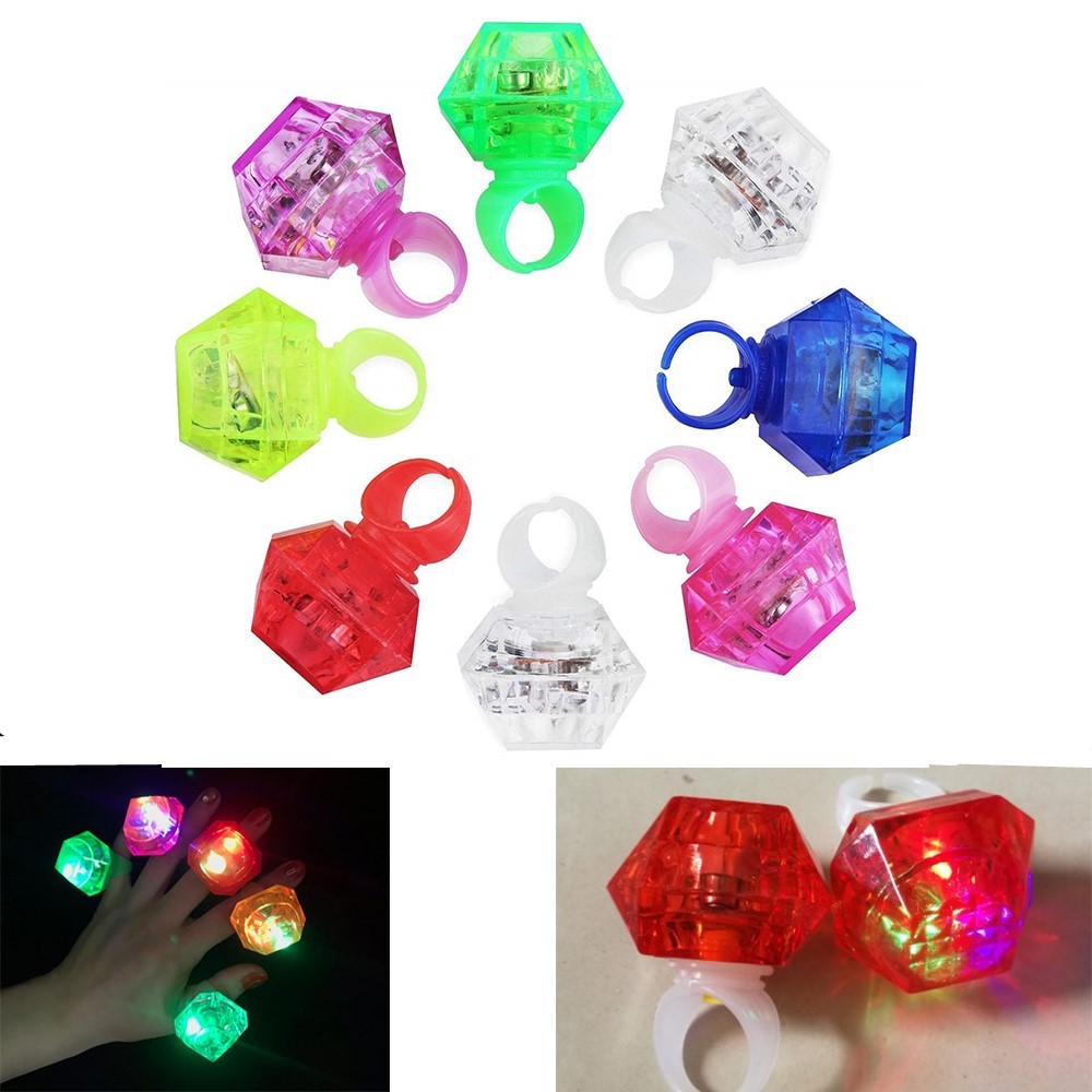 These LED diamond rings are a great accessory for many events! When flashing with beautiful, bright multicolored LEDs, you cannot miss this jumbo gem ring feature 3 functions: fast blinking, slow blinking, and color morphing. To activate, simply press the button on the bottom. Batteries are included and installed.