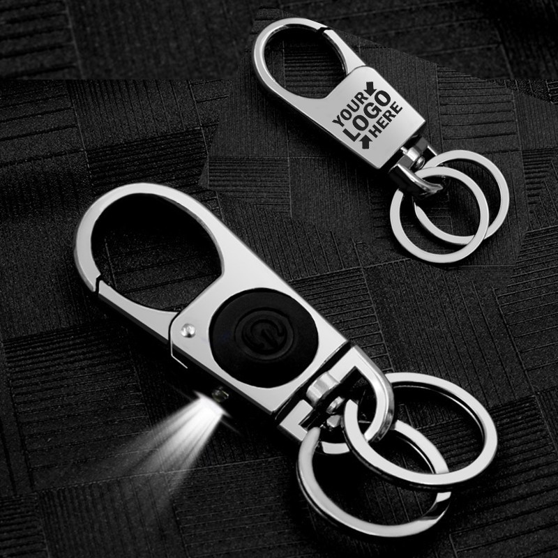 This unique design keychain is made of high quality Zinc Alloy. It measures 3 2/10"X1". Functionality meets affordability with this high-powered flashlight LED keychain! This handy product features double rings and bright white LED lights and easily attaches to your key ring to provide a convenient light source no matter where you go. It is a great handout for safety seminars, job fairs, car dealerships and more, and it can be customized with a brand imprint for corporate exposure.
