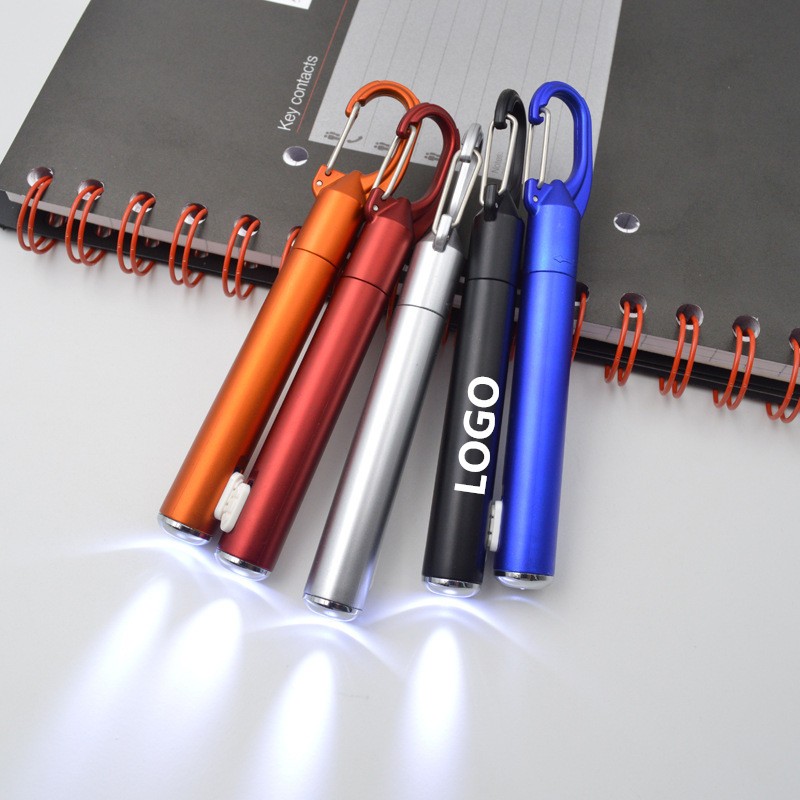 Unique ballpoint pen features with LED flashlight and carabineer key holder. This portable item is designed as a promo gift for vacation, outdoors, sports and travel. What an outstanding promotional giveaway! Customize with an imprint of your company logo and message for increased brand exposure.