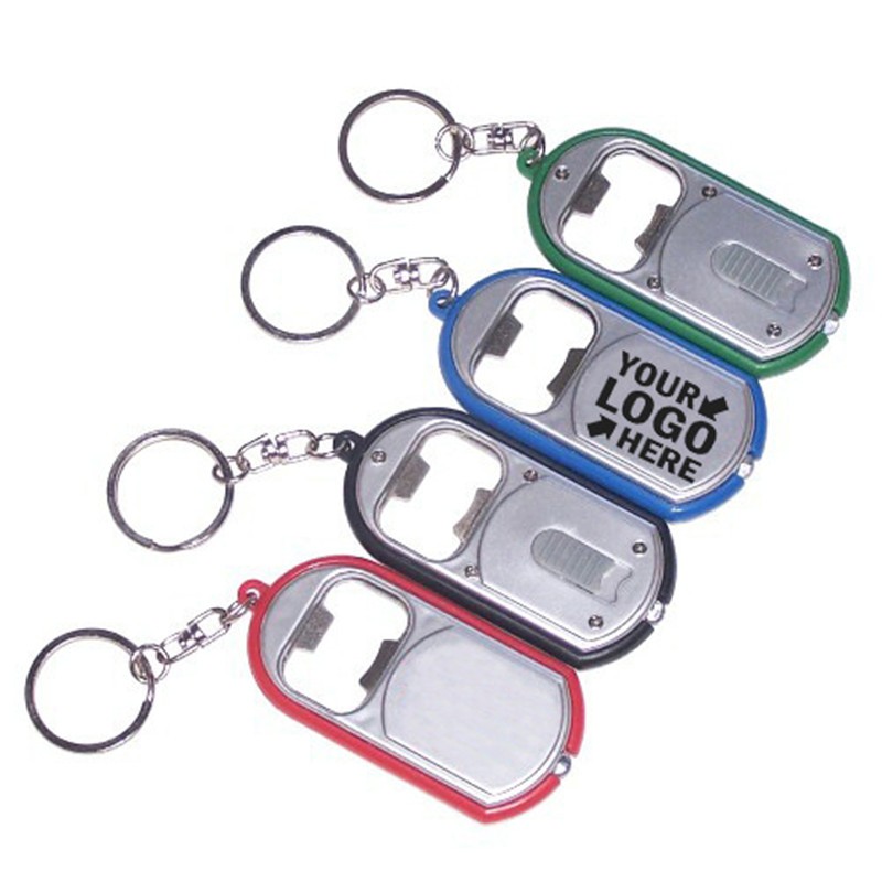 This convenient bottle opener features and LED light and a key chain. It is measuring 2 3/4"x 1 4/10" .You can use On/Off power button to free up your hand! No need to keep pushing the button for power. A perfect promotion for tailgates, company parties, or even tradeshows, this key chain is sure to generate maximum brand recognition!